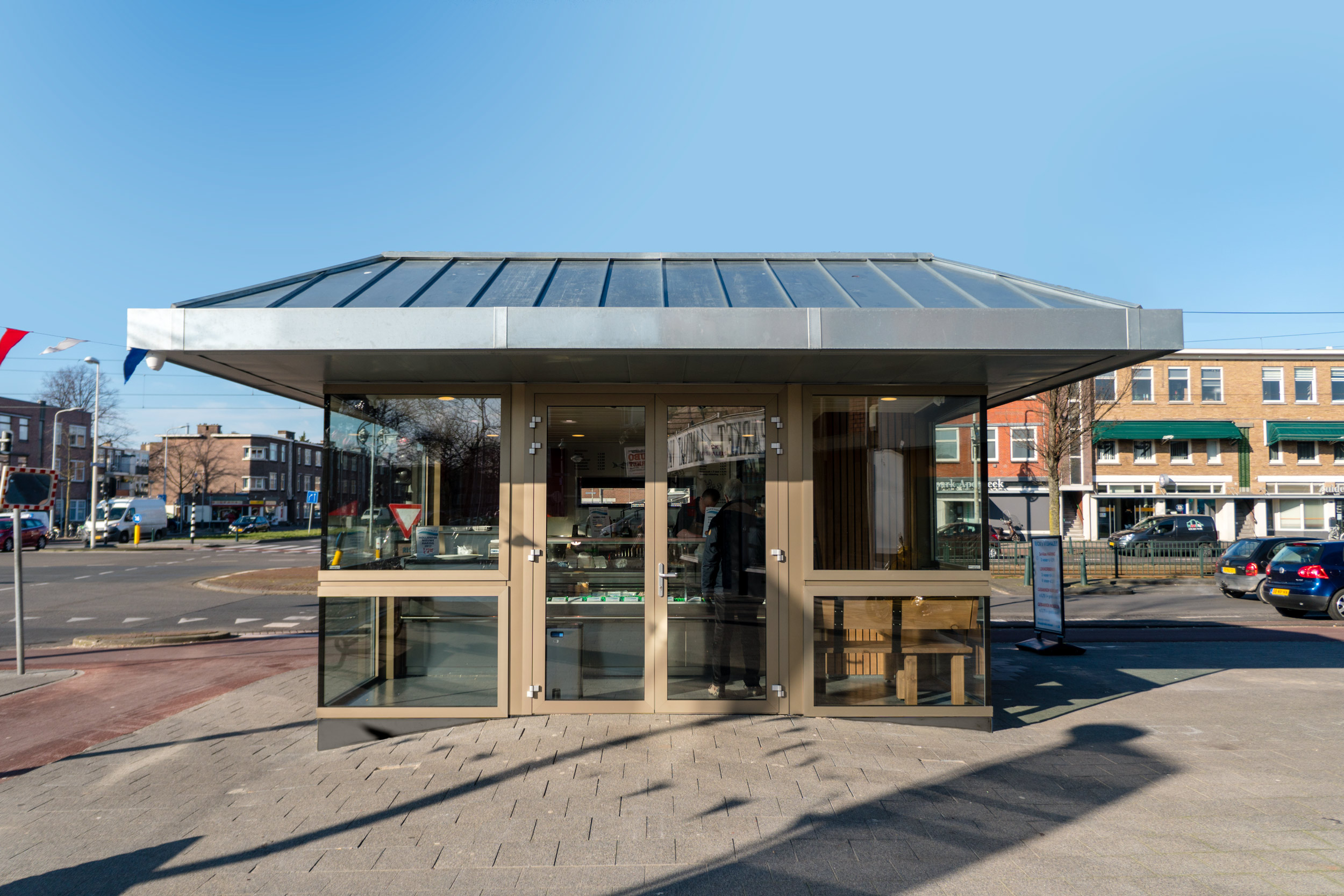 Na de oplevering van de kiosken in de Fahrenheitstraat zijn we benaderd door Rick Buys. Voor zijn vishandel heeft DAVL Studio deze nieuwe kiosk ontworpen. Het is een uniek ontwerp, die past de familie van de kiosken in de Fahrenheitstraat. Met grote glasvlakken aan de voorkant en zijkant heeft de kiosk een open en uitnodigend karakter. Het zinken dak verbergt de nodige installaties en zorgt dat mensen buiten ook droog kunnen staan. Binnen is er een grote koel- / toonbank, keuken(tje), en toilet. Alles wat er nodig is voor een succesvolle onderneming te laten draaien op een klein oppervlak.