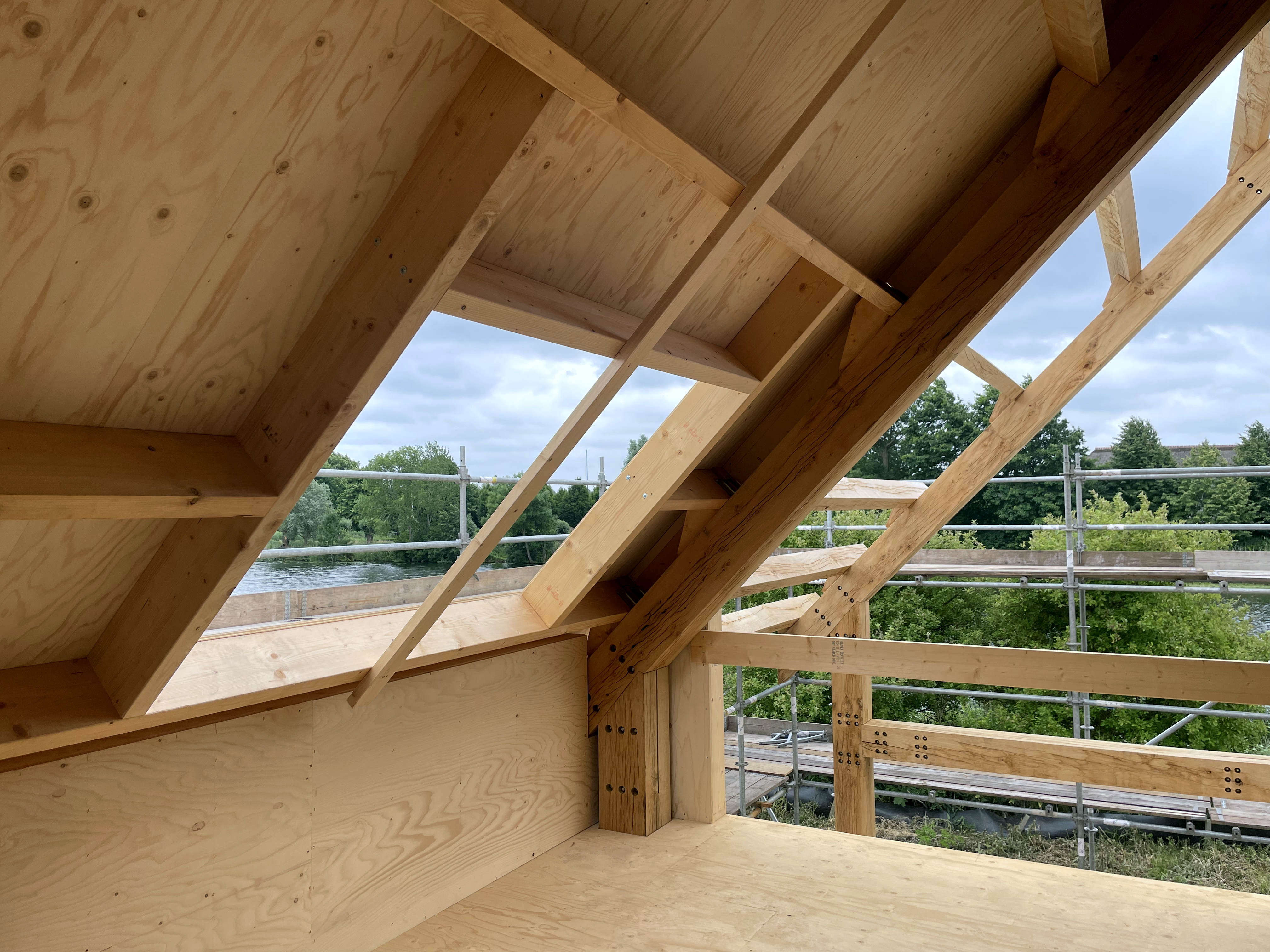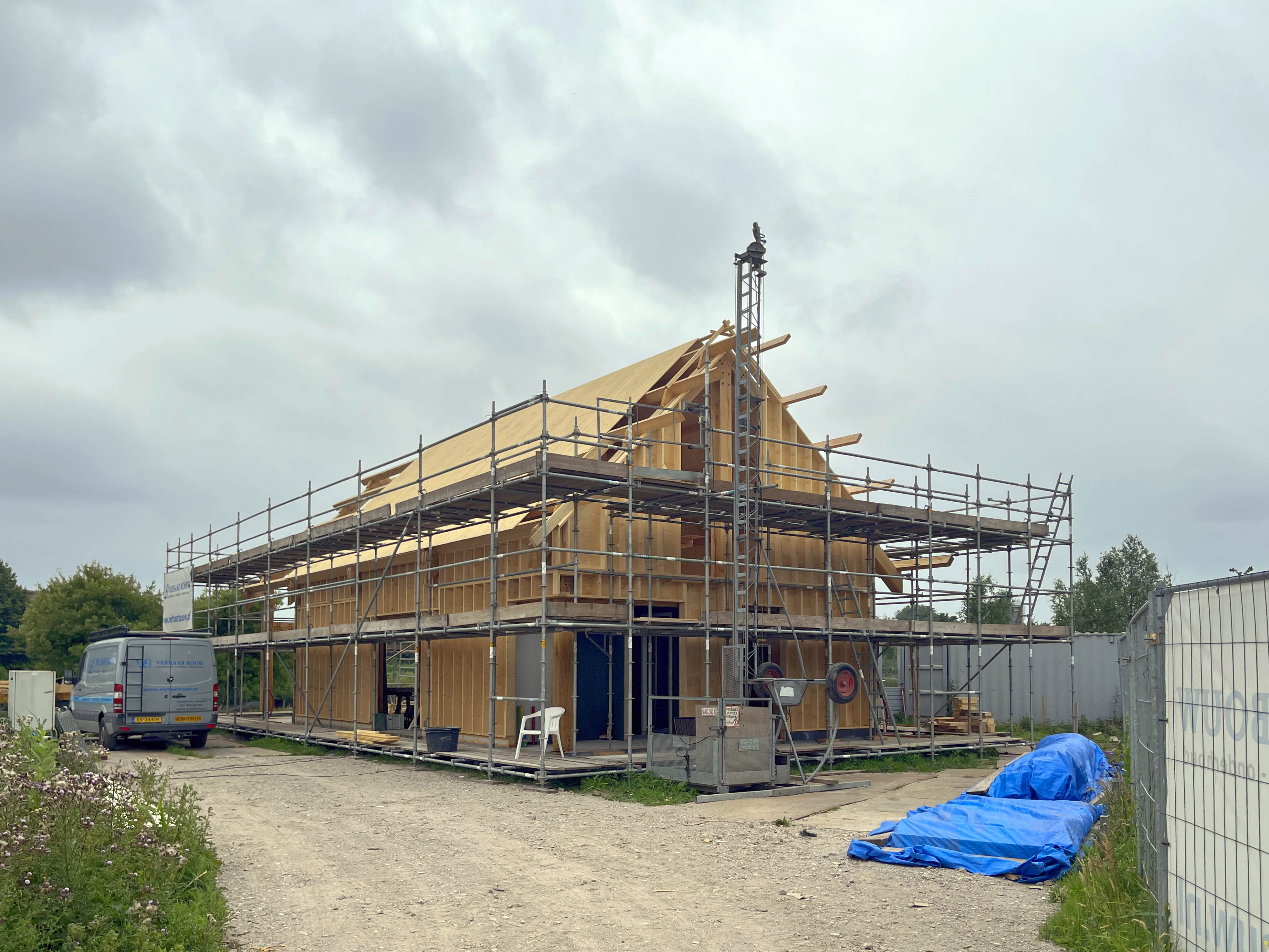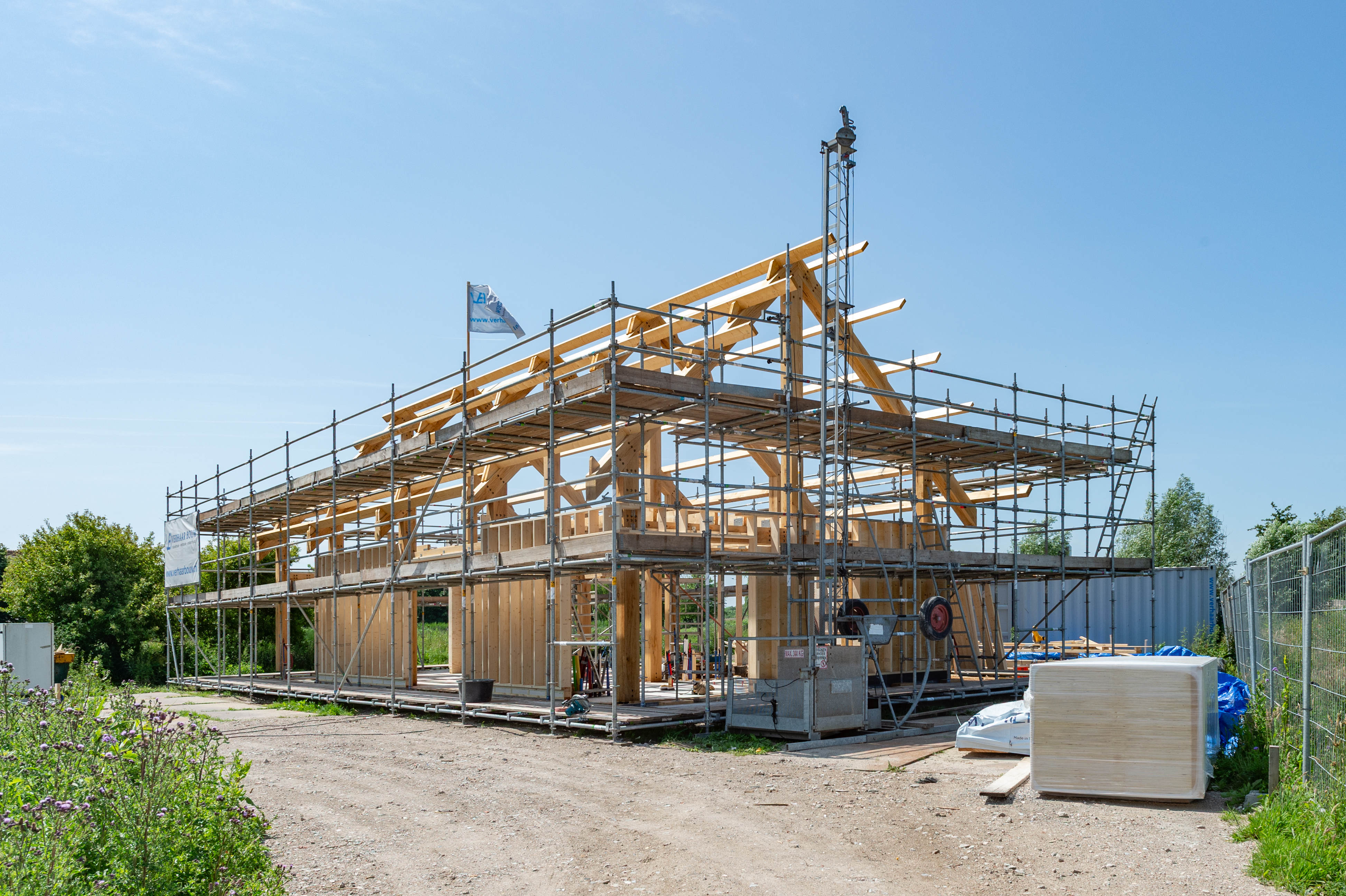 De bouw van de houten schuurwoning is op het hoogste punt. De houten constructie met eiken spanten staat overeind. Dankzij de toepassing van massief hout en doordachte verbindingen krijgt het interieur nu al een warme en robuuste uitstraling. Grote raamopeningen bieden straks een weids uitzicht over het omliggende landschap.