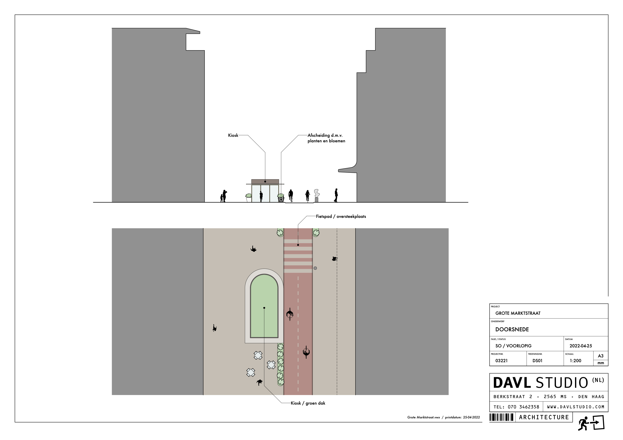 **De Grote Marktstraat in Den Haag heeft een identiteitscrisis: is het een fietspad of voetgangerszone? Dagelijks rijden er meer dan 15.000 fietsers door de drukke winkelstraat, maar officieel is het geen fietspad. Deze onduidelijkheid leidt tot verwarring en ergernis. Reden voor architectenbureau DAVL Studio om dit voorstel te doen voor de Grote Marktstraat. Het ontwerp zorgt voor duidelijkheid en voorkomt verwarring. Het fietspad wordt gescheiden van de voetgangerszone. Tegelijk wordt er groen toegevoegd en plek gecreëerd voor kiosken.**