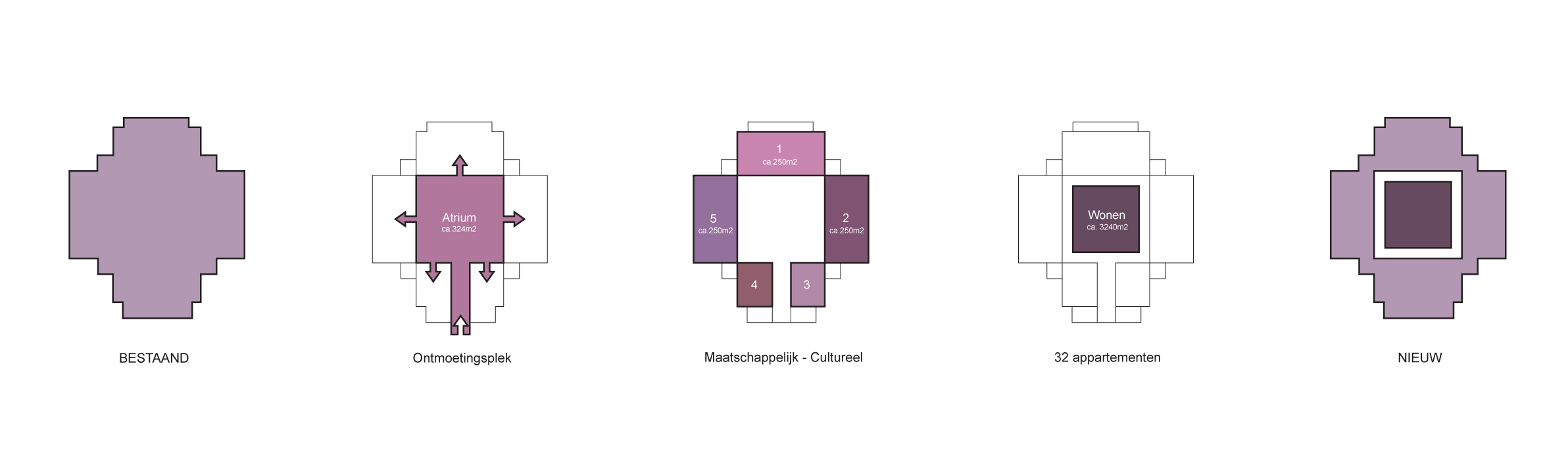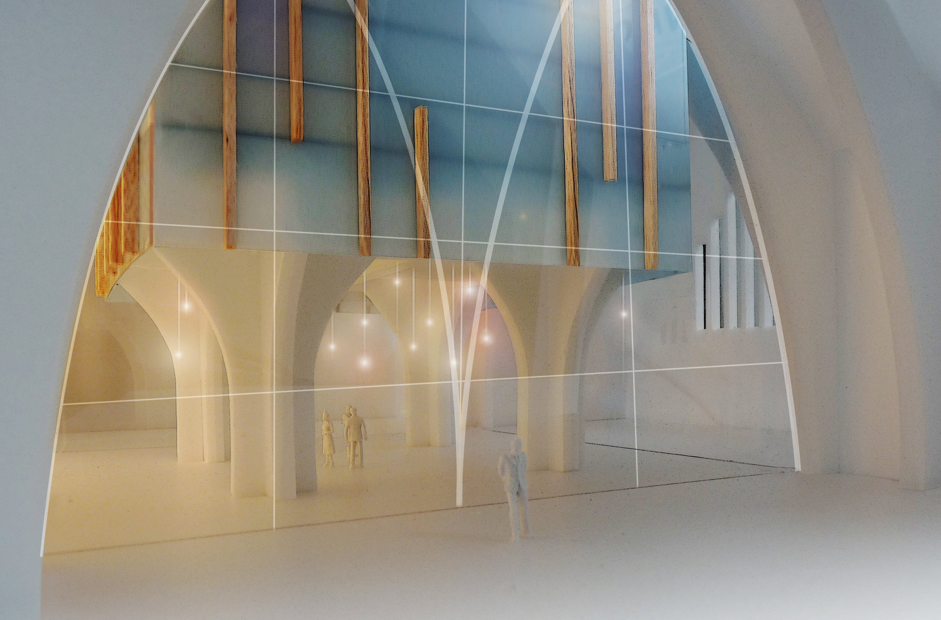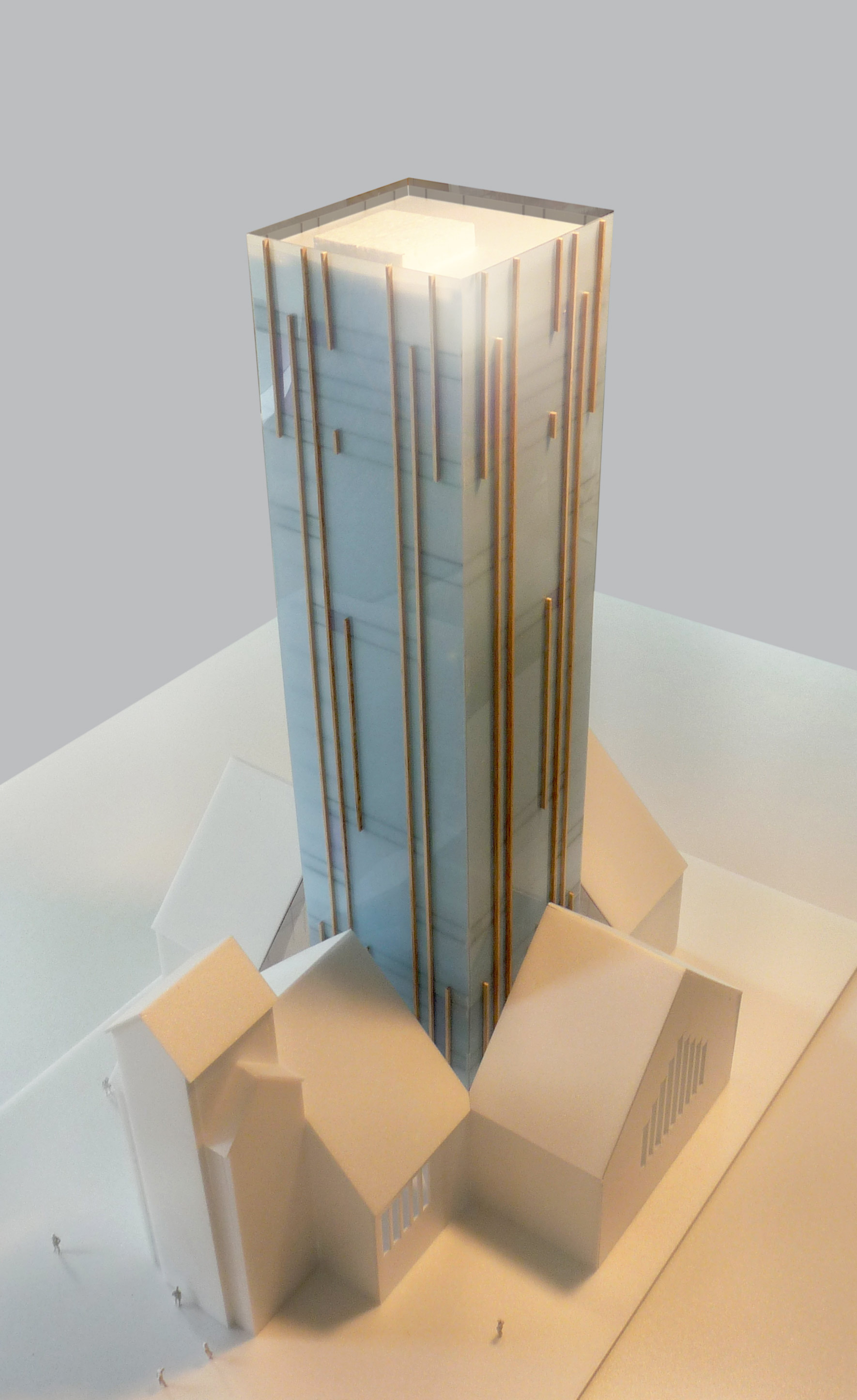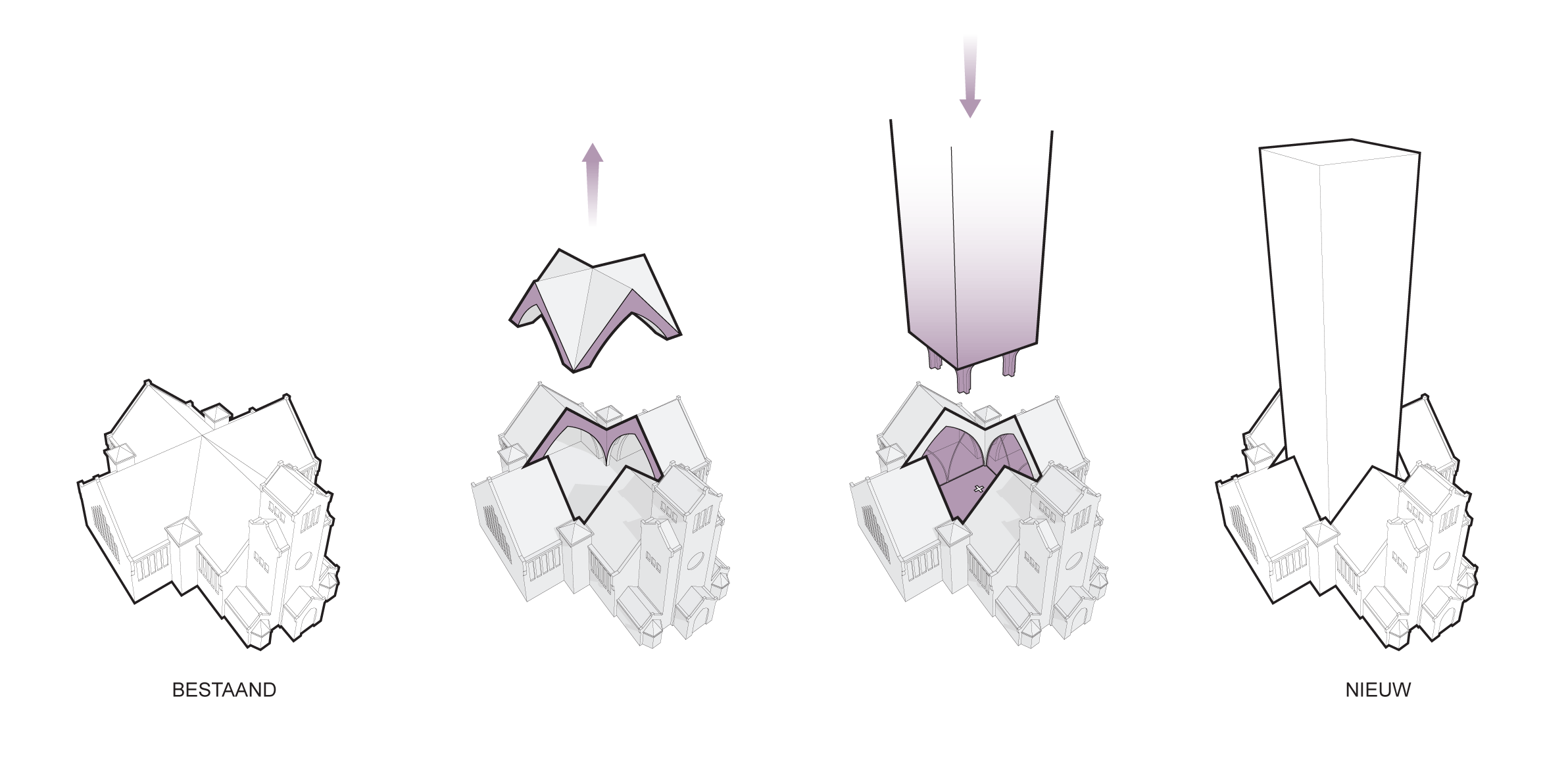 Het dak boven het kruispunt van de kerk verdwijnt en krijgt op deze plek een nieuwe ‘kerktoren’: een slanke en vrijstaande toren van 70 meter hoog. Het bestaande gebouw wordt hierdoor verdeeld in vier afzonderlijke ‘beuken’ die centraal ontsloten zijn vanuit een levendig middenplein in de vorm van een open atrium van circa zeven meter onder de toren. De scheidingen tussen het plein en de beuken zijn transparant waardoor de oorspronkelijke ruimte zoveel mogelijk behouden blijft. Het ‘schip’ wordt betrokken bij het plein en is tevens de centrale ontsluiting voor de woontoren.