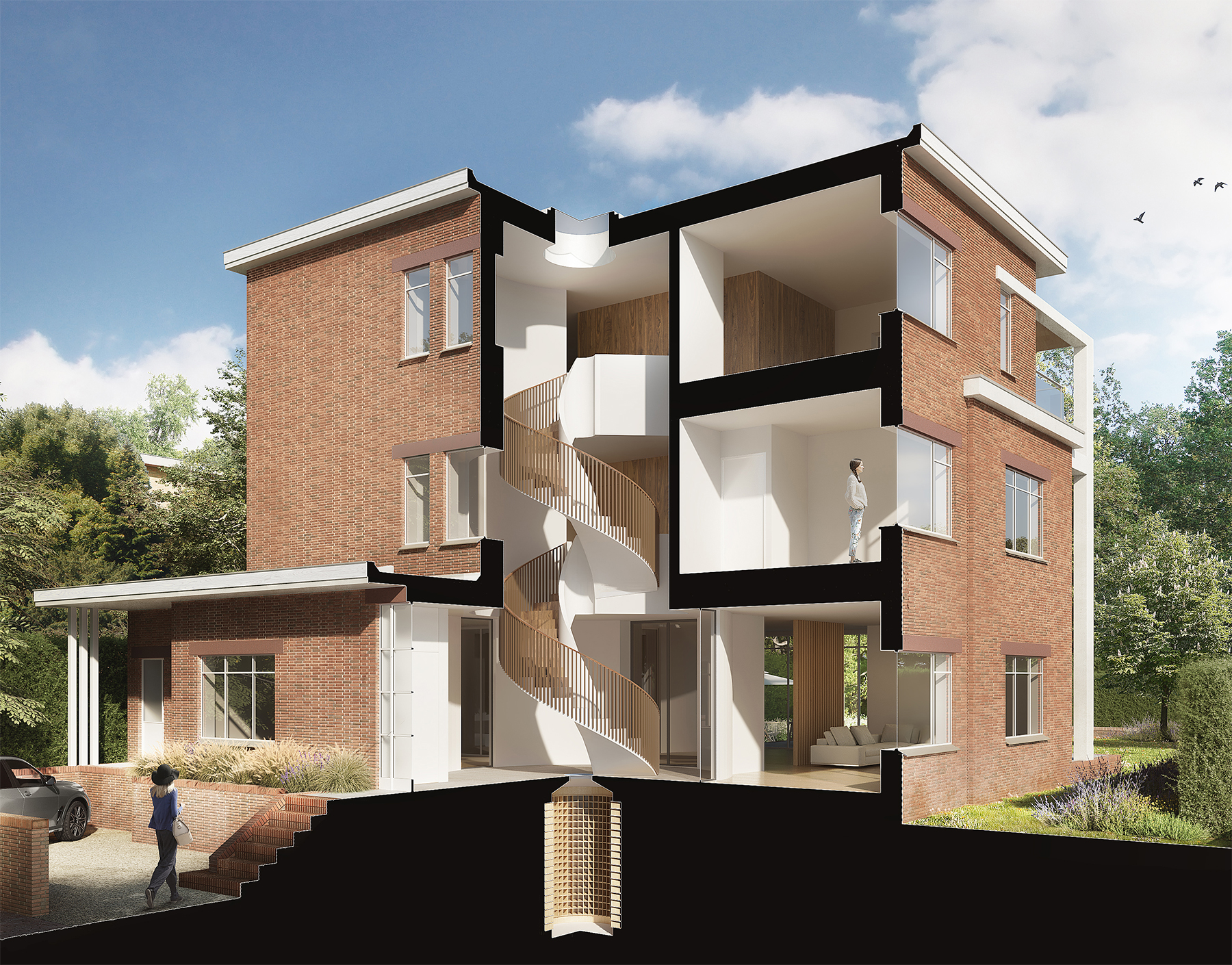 Totaalrenovatie en -verbouwing van een villa in Den Haag. Het nieuwe trappenhuis is het hart van de woning en zorgt voor de symmetrie die het huis verdient.