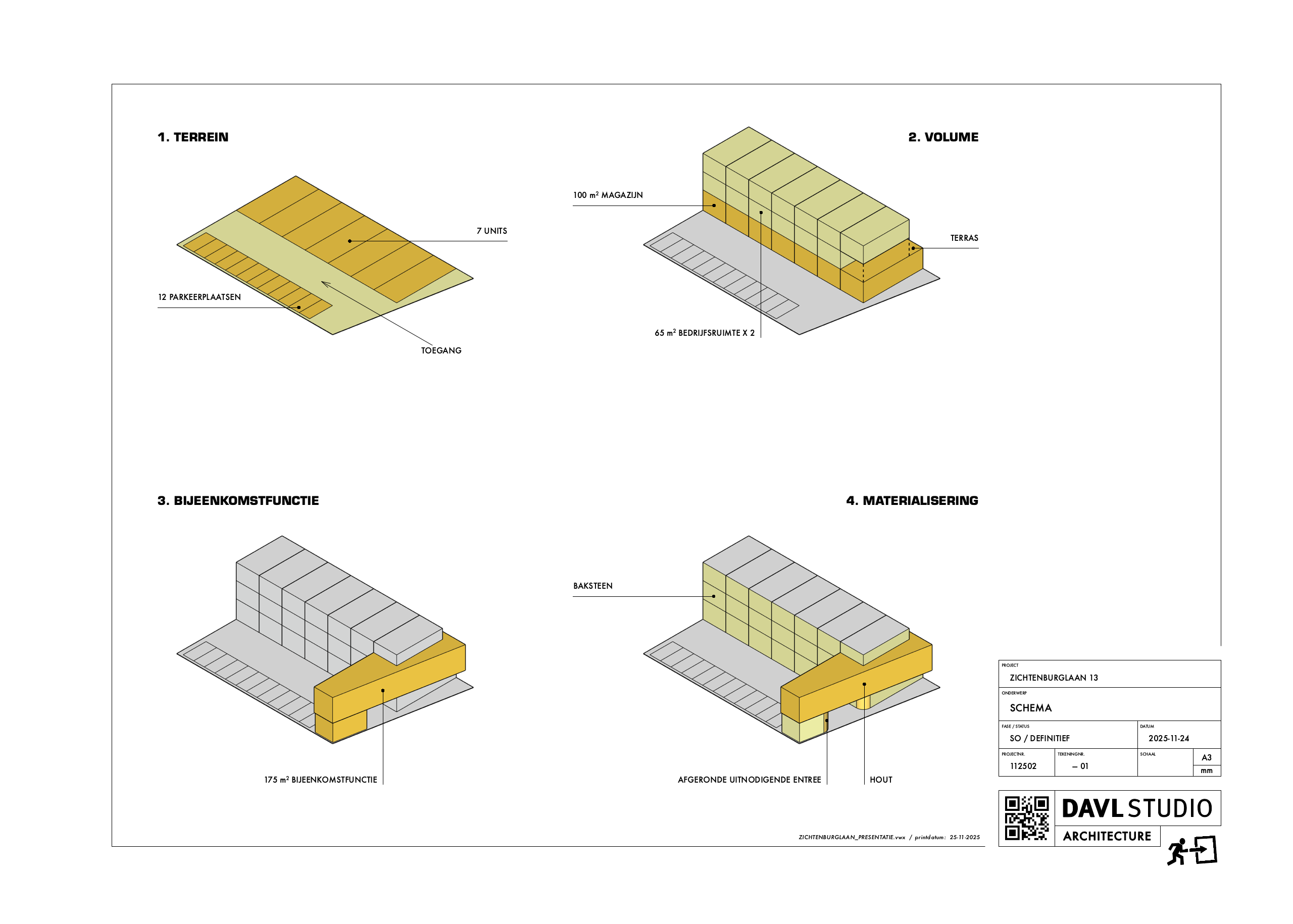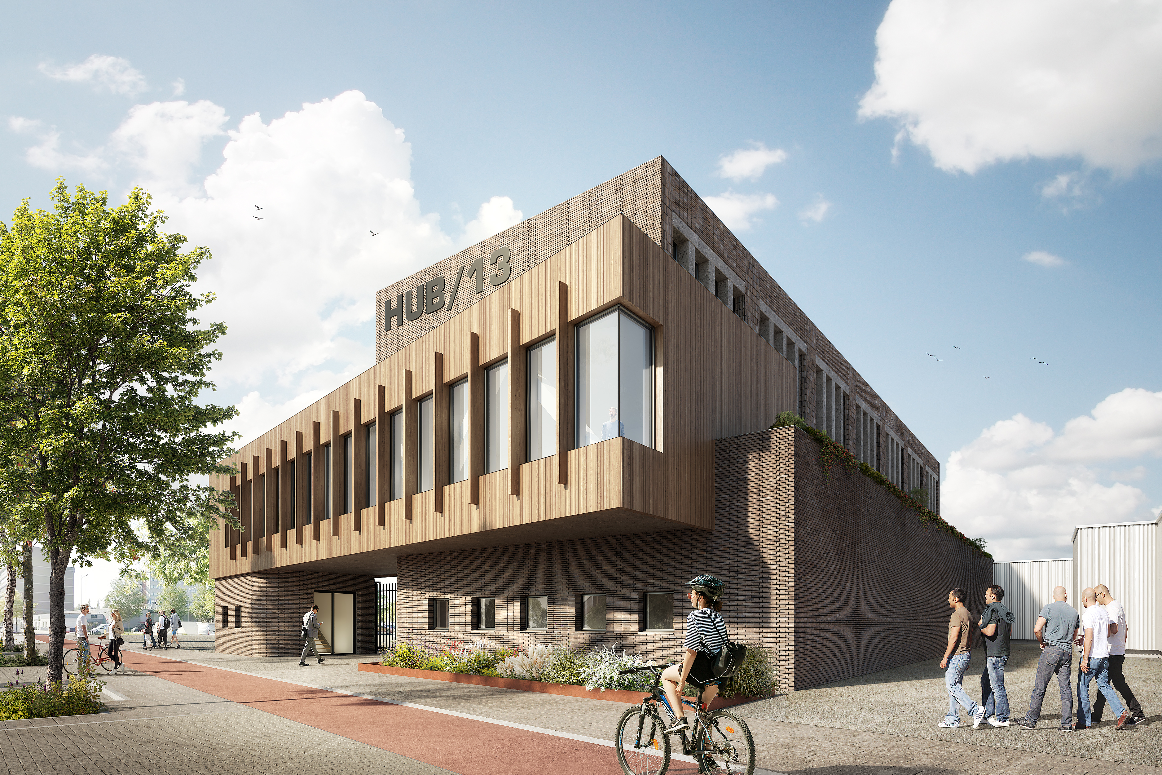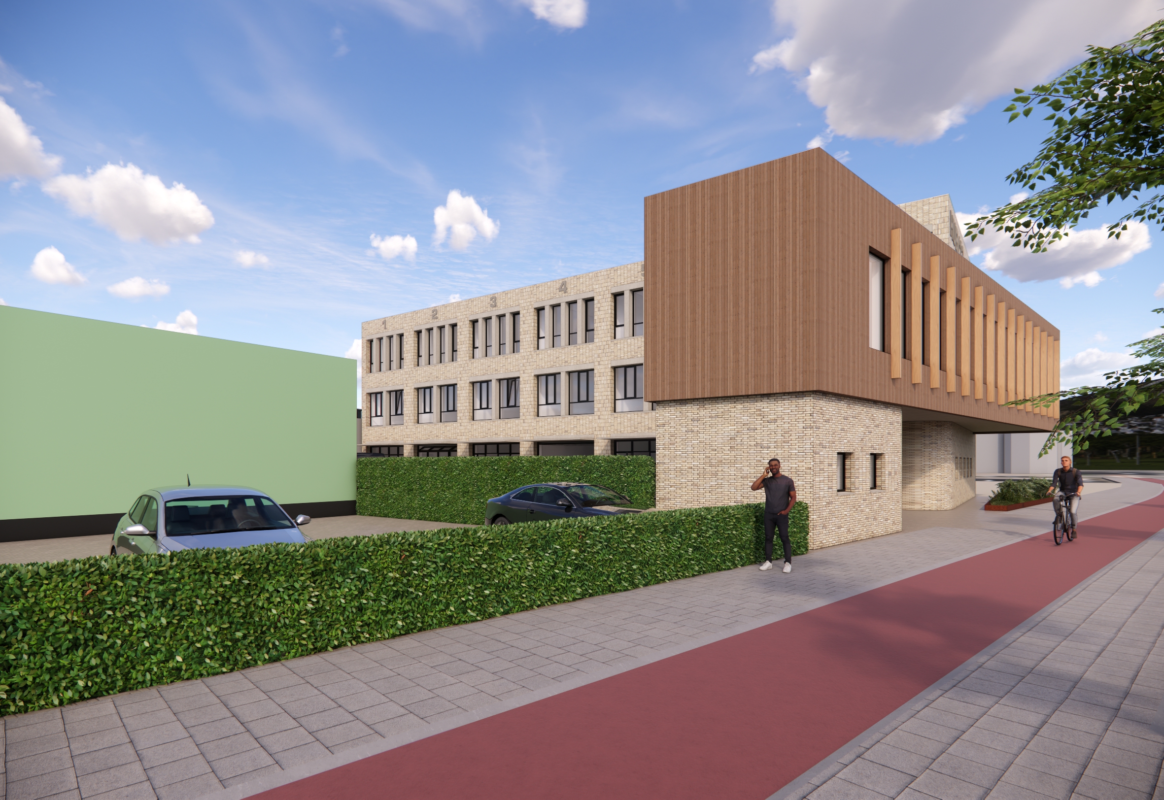 De architectuur van het gebouw is functioneel en duurzaam. De robuuste uitstraling, gerealiseerd door de combinatie van baksteen en bamboebekleding, creëert een professioneel en uitnodigend gebouw dat de tand des tijds doorstaat.